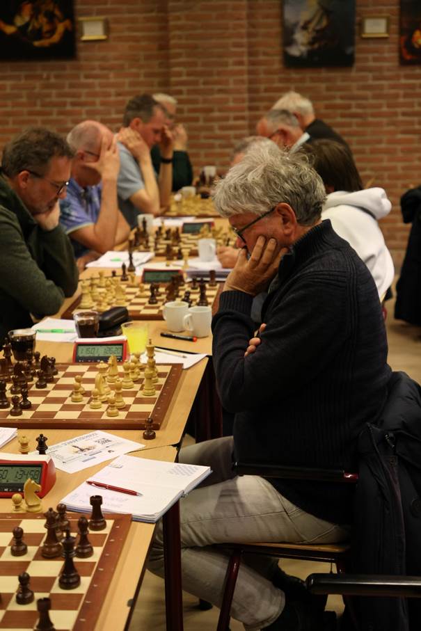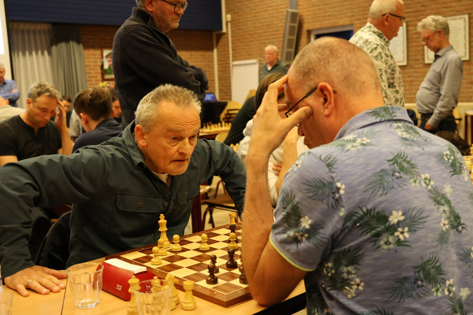 Op bord 6 zette de tegenstander van Albert al de aanval in voordat hij kon rokeren. Door de slecht geplaatste loper van Albert koste dit hem een pionnetje, maar hij wist het knap dicht te houden. Met nog maar 5 minuten op de klok en Albert met 35 zag zijn tegenstander er geen heil meer in en ze besloten er een remise van te maken. Dit tijdsvoordeel in de eindfase is niet onbekend voor de heer Sluiter, die een snelle speler is. Maar ik kwam erachter dat hij ook op andere manieren slim wat tijd pakt. Bij de heren toiletten stond een rij en alle schakers bleven daar (te) braaf wachten terwijl hun tijd weg tikte. Albert was pragmatisch en schoot het dames toilet binnen, vrouwelijke schakers waren er immers deze avond niet te vinden. Zo pak je dus ook tijd! Bij schaken bepaald de mindset alles.