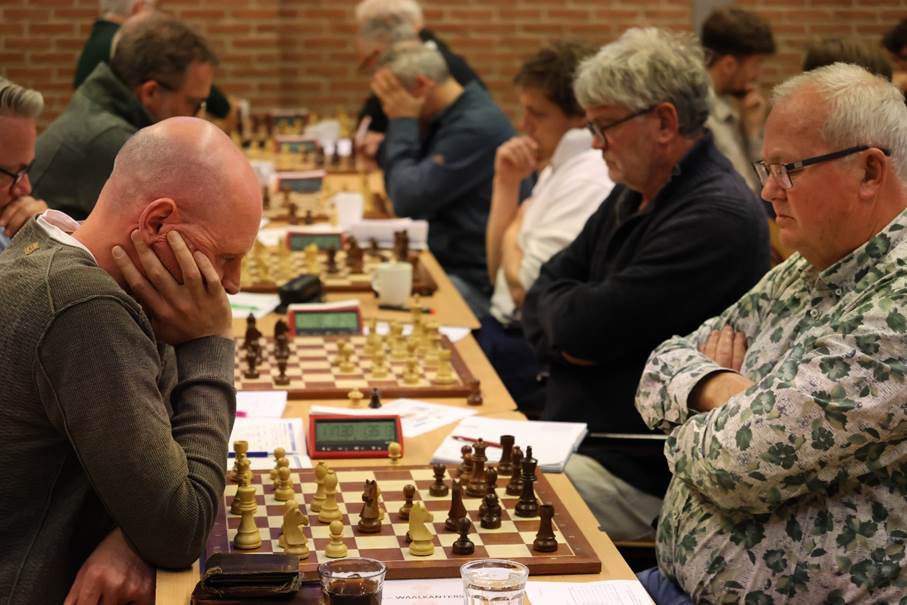 Naarmate de avond vorderde kregen de Waalkanters het langzaam aan lastig. Op bord 1 kwam Arian een pionnetje achter te staan en zijn loper (!!) op c1 bleek lang gedoemt om zijn geïsoleerde pion op b2 te dekken. Bij bord 2 was het een evenwichtige situatie voor Eric, waar langzaam aan wat spanning werd op gebouwd op de open c-lijn met wat Torens en Dames. Joost had een mat dreiging op h3 af te slaan, maar dit was geen moeite voor hem en hij wist zijn a-pion redelijk ver aan de andere kant van het bord te krijgen. De partij van Ricardo (bord 4) begon al behoorlijk complex te worden en hij leek in het gedrang te komen; een pionnetje achter en een dame op de 7e rij. Nooit prettig, gelukkig was er enige compensatie doordat hij zijn toren op de 2e rij van zijn tegenstander had weten te krijgen. De pot van Peter op bord 5 lag redelijk in evenwicht, met vooral wat spanning over de diagonalen met, alweer de lopers, die naar de centrum pionnen staarden, voor zowel zwart als wit.