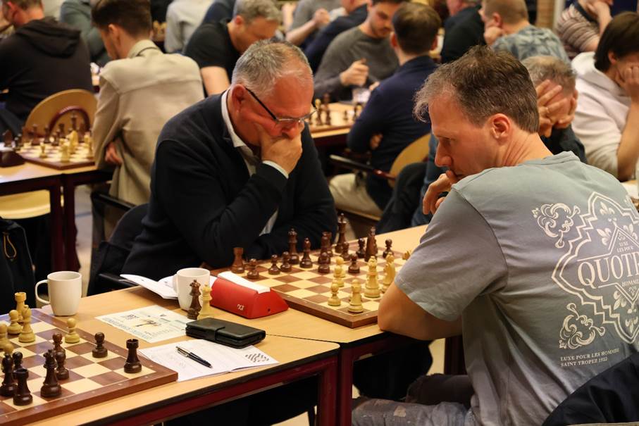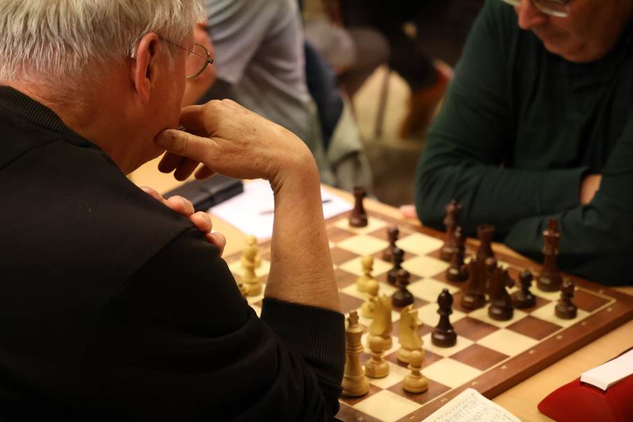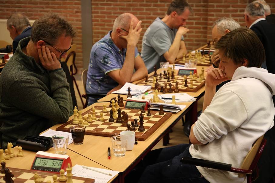 Terug naar de borden; na de remise van Albert was het Arian die moest opgeven. Zijn achterstand van inmiddels 3 pionnen werd hem uiteindelijk te veel. Ook Eric moest in zijn tegenstander de meerdere erkennen; de uitwisseling op de eerder genoemde c-lijn pakte voor hem nadelig uit en kost hem een pion en een vervelende toren op de 7e rij… dit zou toch de avond van de lopers worden? Het resulteerde in een stelling die niet te houden was. Oei, 2.5 – 0.5 achter… ook voor Peter (bord 2) ging het de verkeerde kant op; zijn mislukte mat aanval kost hem zijn dame. De 3.5 punten en dus de overwinning waren binnen voor Elster Toren, het leek dan toch de avond van de (kerk?) toren te worden. Joost had inmiddels 1 van zijn pionnen tot de overkant van het bord gekregen waardoor zijn tegen stander zijn Toren moest opgeven. Daarintegen waren de zwarte pionnen zo ver doorgelopen dat ook Joost er een Toren voor moest geven. In de eindspel situatie die daaruit resulteerde was de koning van Joost op a8 te ver verwijderd van de andere pionnen, wat hem uiteindelijk zijn kop koste.