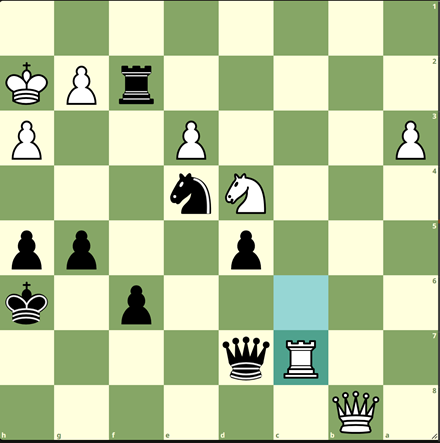 Maar het echte spektakelstuk van de avond had zich enkele minuten hiervoor afgespeeld op bord 4. Ricardo had het met een pion minder moeilijk, maar beide heren leefde op de increment van hun klok. Dapper en onbevreesd bleef hij terug knokken. Tot het fantastische moment dat wit een schaakje over het hoofd zag wat tot een mat in vijf kon leiden! Met enkel 10 seconden op de klok gaf Ricardo schaak en wist het juiste vervolg te vinden doormiddels van een toren offer! Een paar zetten later was het mat. Vervolg op de stelling hieronder: 1. Rc7 Qd6+ 2. Kg1 Rxg2+ 3. Kf1 Rg1+ 4. Ke2 Qh2+ 5. Kd3 Qd2#